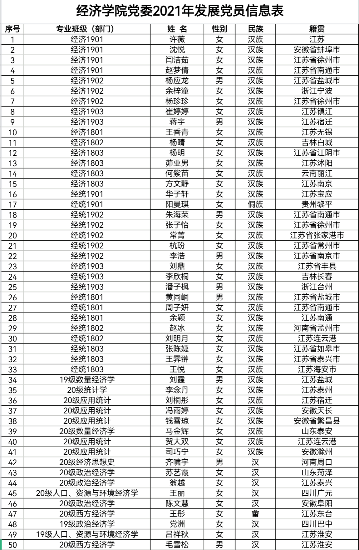 根据《发展党员工作实施细则》有关规定,经学院基层党支部考察、学院党委预审,拟接收许薇等50名同志为中共预备党员。现将名单予以公示: