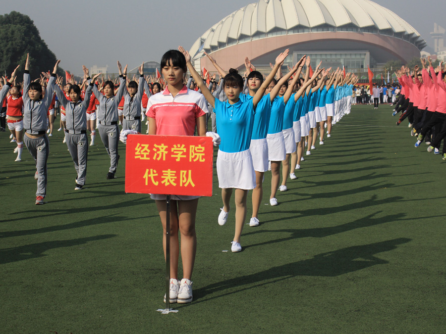 方阵代表队身穿亮眼夺目的蓝白运动服,高举“经院健将,劈波斩浪,气贯长虹,力破苍穹”的口号牌;蓝色的院旗下,广播操代表队以整齐划一的动作,昂扬向上的精神面貌,充分展现了体育博彩