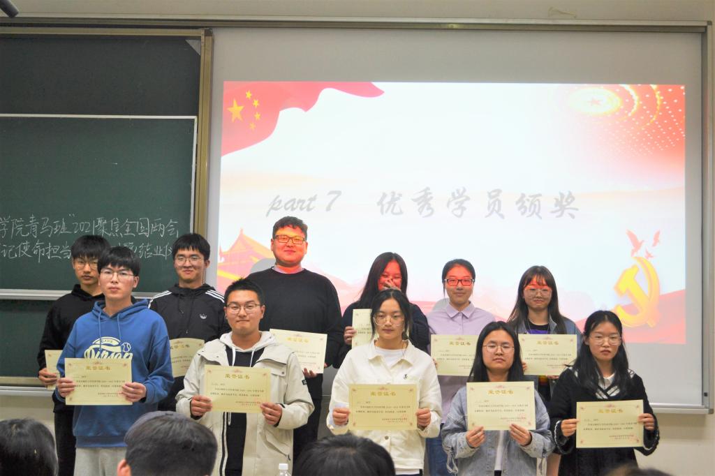 答辩活动之后,经过评委的现场评分,结合历次青马班活动成绩,评选出了十二位优秀学员,主持人当场宣读优秀学员名单并合影留念,后各组组长代表全组领取结业证书。