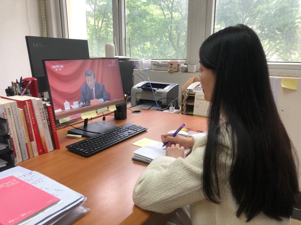 师生代表认真观看庆祝大会直播,感受颇深,不时报以热烈的掌声。