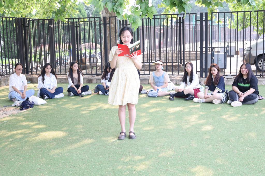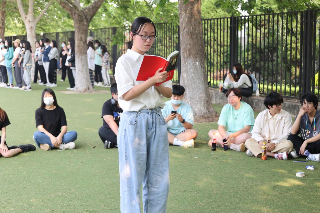 2102班的汪琰同学领读到“同学们到基层去,到边远地区去,到社区去,到农村去,到军营去!……”时,她停下来,神色动容地与同学们分享自己参加返家乡社会实践活动,做驻村大学生时为村民排忧解难的经历,鼓励同学们积极参与社会实践活动,以此来长才干、强本领。她强调:我们青年学子既要积极开动脑筋,攻坚克难,开拓全新领域,更要沉心静气,有把冷板凳捂热的勇气和能力。同学们被书中的精神感动,纷纷检阅自身,表示将以时代责任为己任,为实现第二个奋斗百年目标贡献自己的青春力量。
