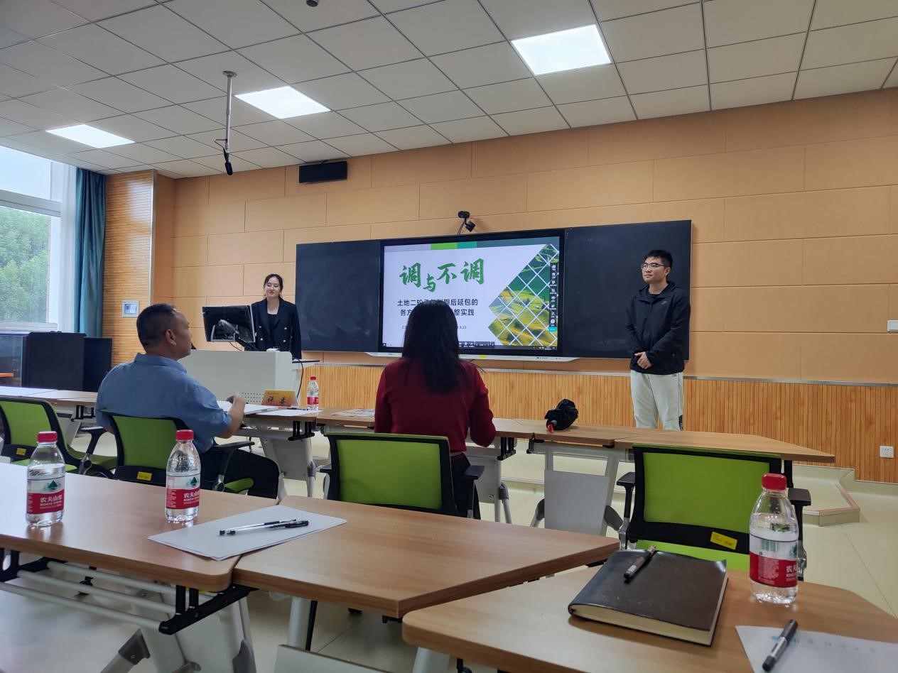 培训会现场氛围积极活跃,项目团队结合PPT,就项目发展现况进行现场答辩汇报。团队成员们根据土地延包的关键词,详细介绍了项目背景、研究方法及已有成果等。