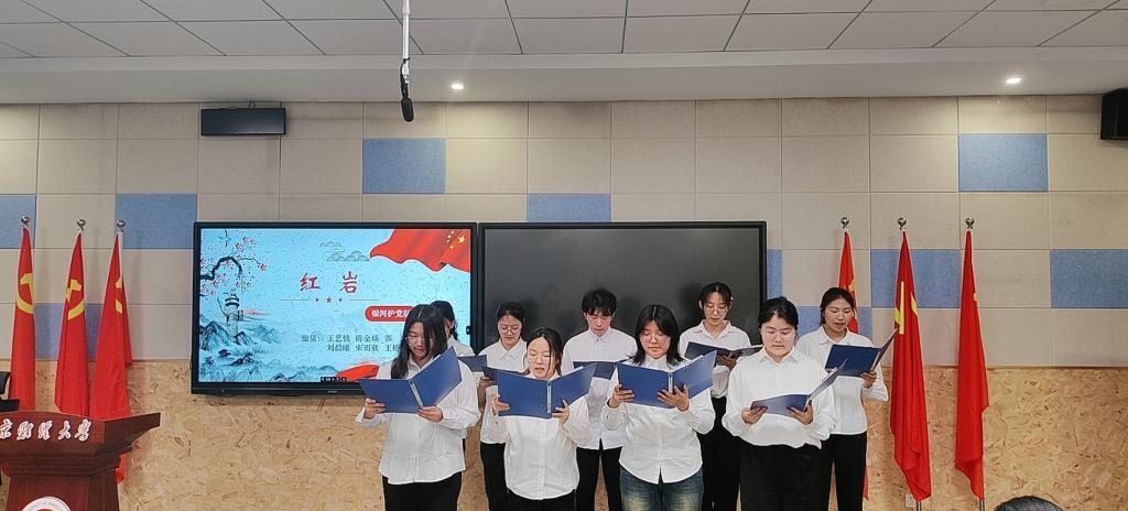 第一党支部、第二党支部党员代表开展党史经典书目领学。他们以满腔的热情和真挚的情感带领同学们重温党的历史,了解党的奋斗历程,讲述铿锵有力、激励人心,在场同学深受感染,纷纷表示要从百年党史中汲取精神滋养和不竭动力,以实际行动践行党的二十大精神,为实现中华民族伟大复兴贡献青春力量。随后,同学们齐声朗诵《红岩》选段,满怀深情的诵读,诠释着革命先辈们不懈奋斗的革命精神。诵读《红星照耀中国》选段时,他们用铿锵有力的声音传达出中国革命运动必胜的信念。“真正的中国人是怎样的?”同学们结合自身实际学习经历和党史学习体会,在《中国人的精神》一书中找到了答案。同学们将手中的书稿高高举起,眼神中充满了坚定和自信。朗朗诵读声,是超越时空的回响,莘莘学子心,是吾辈自强的共鸣。现场掌声雷动,饱含着同学们对革命先烈最崇高的敬意。