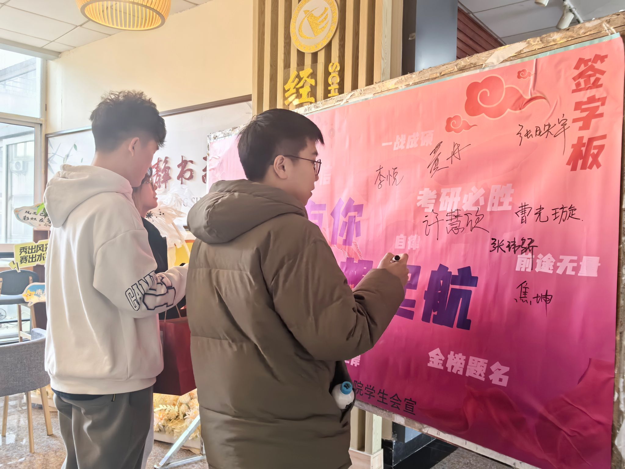 此外,现场还设置了预祝“上岸”的海报,考研学子们纷纷在上面签名合影,展现出他们昂扬的精神风貌与坚定的拼搏信念。哪怕此刻有乌云暂时遮蔽了皎月,但只要坚守初心,持之以恒,终能守得云开见月明。相信不久的将来,海报上的这些签名,定将闪耀在金榜之上。