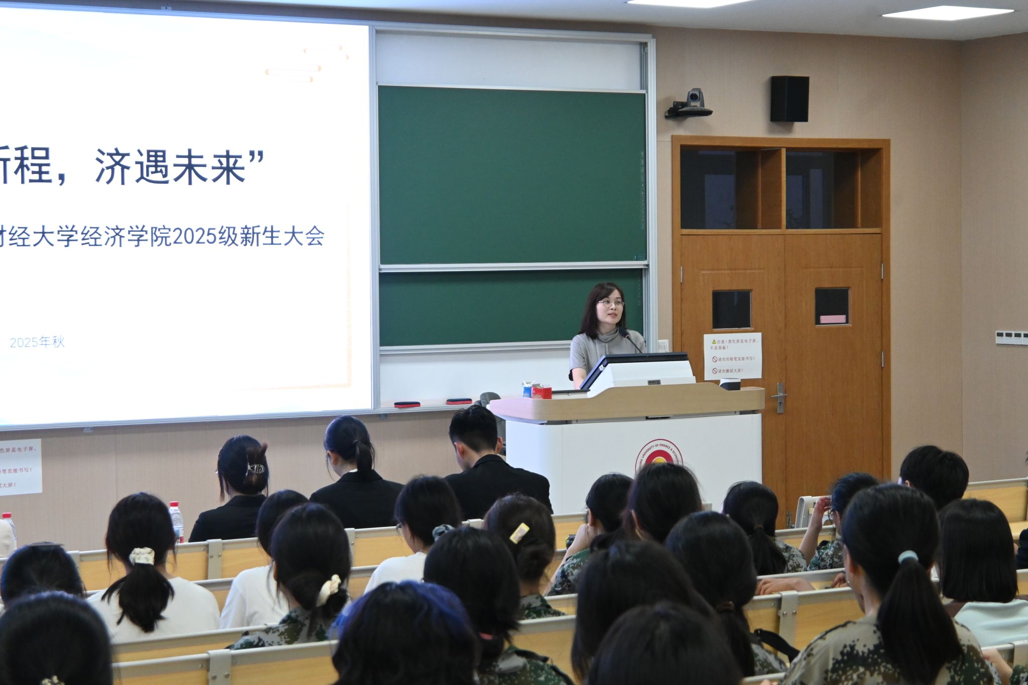 于博观楼201教室举办“经启新程,济遇未来”2025级本科生新生大会,学院党委副书记贾亦璞老师、2025级辅导员梁少颖老师、学院学生组织相关成员以及2025级全体本科新生参与本次大会。