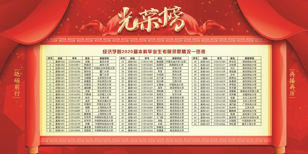 2020届毕业生在全国硕士研究生考试中捷报频传,考研成绩喜人,再创历史新高。全院考研正式录取64人, 其中33名学生录取到双一流高校,经统1603班考取18人,考研升学率高达36%。