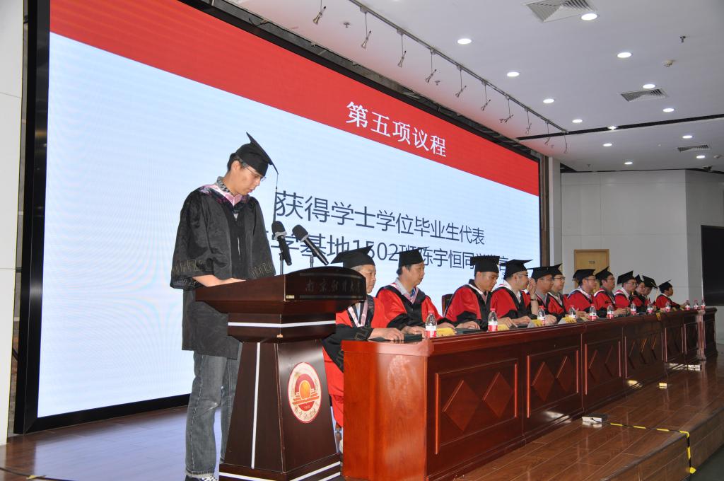 基地1502班陈宇恒同学作为毕业生代表发言。他首先向辛勤培育同学的领导与老师表示由衷的感谢,向全体毕业生表示真诚的祝福。他回顾了四年大学生活的每一瞬间,分享了四年来发生在体育博彩