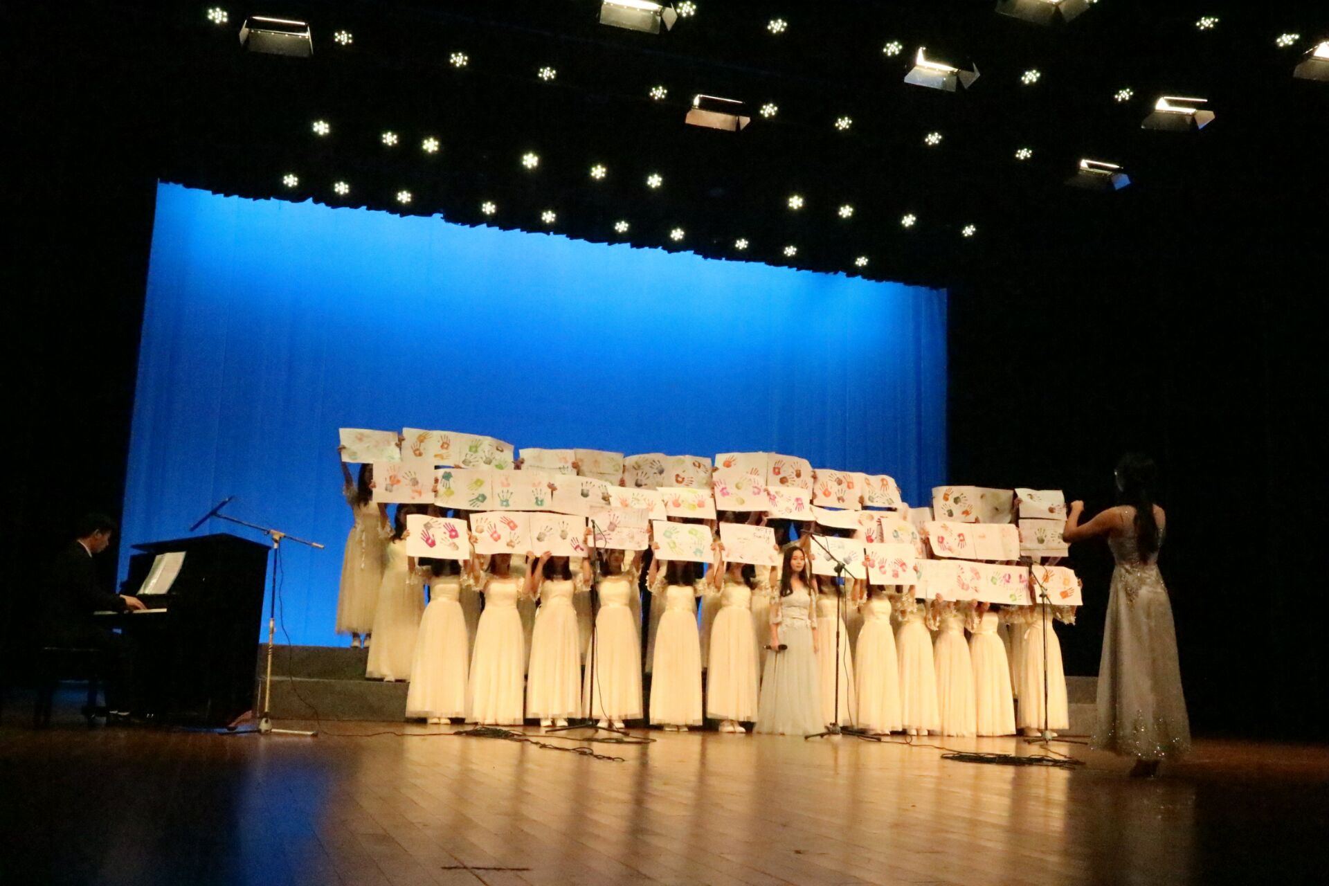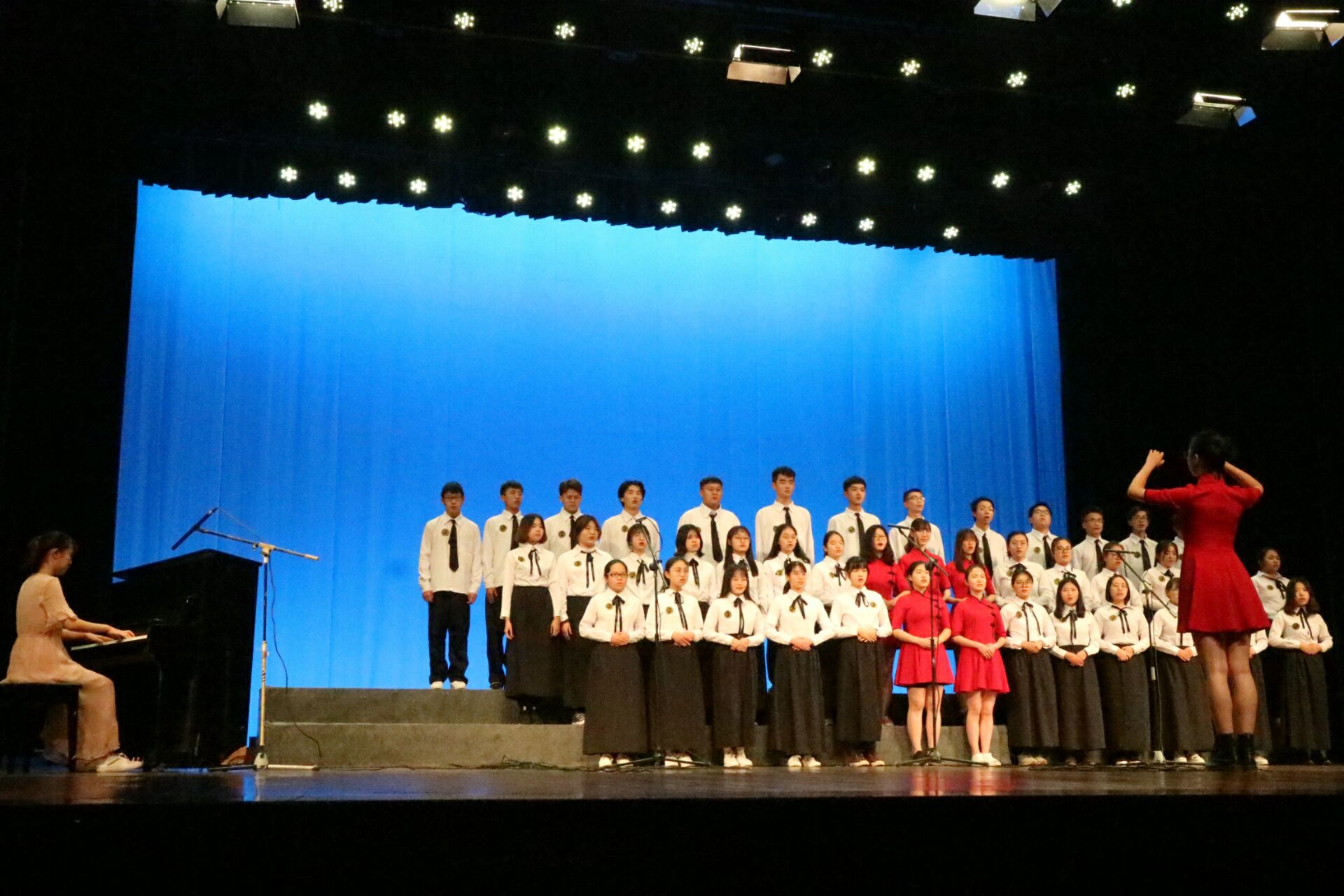 正式比赛前,礼堂会场播放了一段记录我国改革开放40年来的风雨辉煌的沙画视频,并奏唱了中华人民共和国国歌,拉开了合唱比赛帷幕。