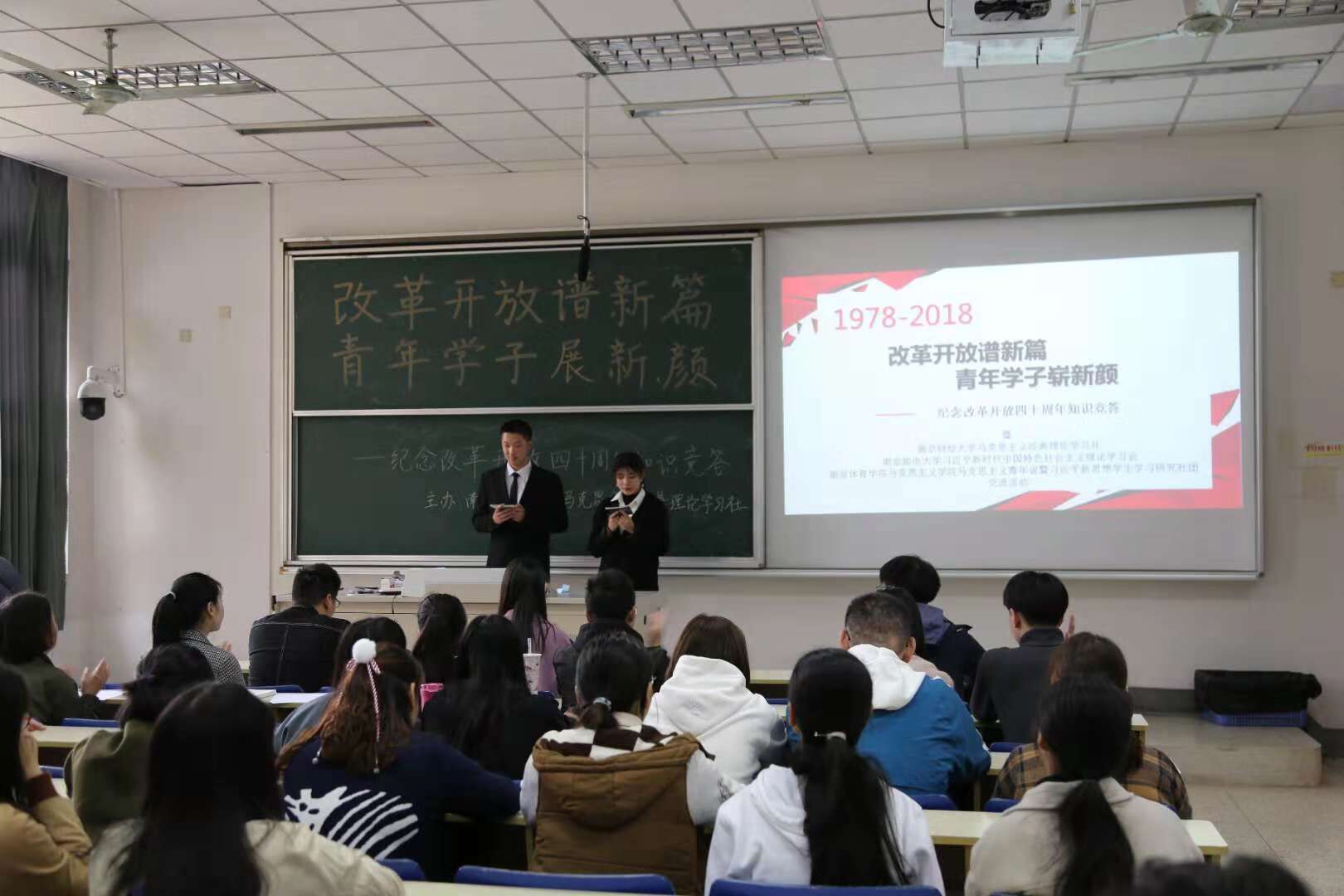 11月11日下午,体育博彩 马克思主义经典理论学习社联合南京邮电大学习近平新时代中国特色社会主义思想学习会、南京体育学院习近平新思想学生学习研究社,在德经楼101举行了“改革开放谱新篇,青年学子展新颜”——庆祝改革开放四十周年知识竞答活动,体育博彩 党员、入党积极分子们到场观看了比赛。 活动正式开始前,体育博彩 马克思主义学社社长庞萍、南邮习学会会长吴忧、南体马院新思想研习社团社长翁凡棋依次进行了发言。首先,庞萍同学以主办方身份对来自南邮、南体的社团同仁们表示了热烈的欢迎和衷心的感谢,同时对此次知识竞答活动提出了要求和期望,并表示希望今后加强三校思想政治类社团的交流与合作。吴忧同学对社团的未来发展方向提出了热切展望,翁凡棋同学则表示希望加强社团间的联系并欢迎兄弟院校社团去南体进行交流。 本次庆祝改革开放四十周年知识竞答活动分为必答题、抢答题和风险题三个环节。选手们一个个你追我赶、不甘示弱,对改革开放四十年的历史都有较好的理解和掌握,场上竞争十分激烈。经过激烈的角逐,南财队获得了卓越青年奖,南邮、南体则分别精神文明奖和思想进步奖。活动最后进行了各队的颁奖和合影环节。 此次改革开放四十周年知识竞答宣扬了改革进取的创新精神,促进了青年学子对相关历史的深入了解,展现了当代青年学子积极向上的精神风貌。