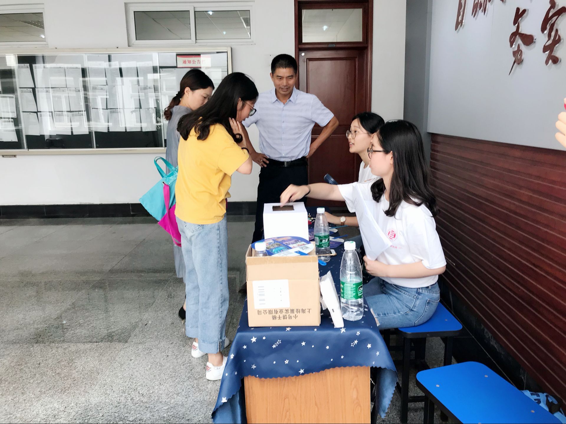 虽然时间尚早,但已有新生前来报到,德经楼三楼逐渐被忙碌的气氛包围,老师和志愿者们有条不紊地进行着一站式学籍注册,报到登记,发放资料,并邀请同行的家长参加下午的家长会。 报到处最为出挑的可能是志愿者装扮的体育博彩