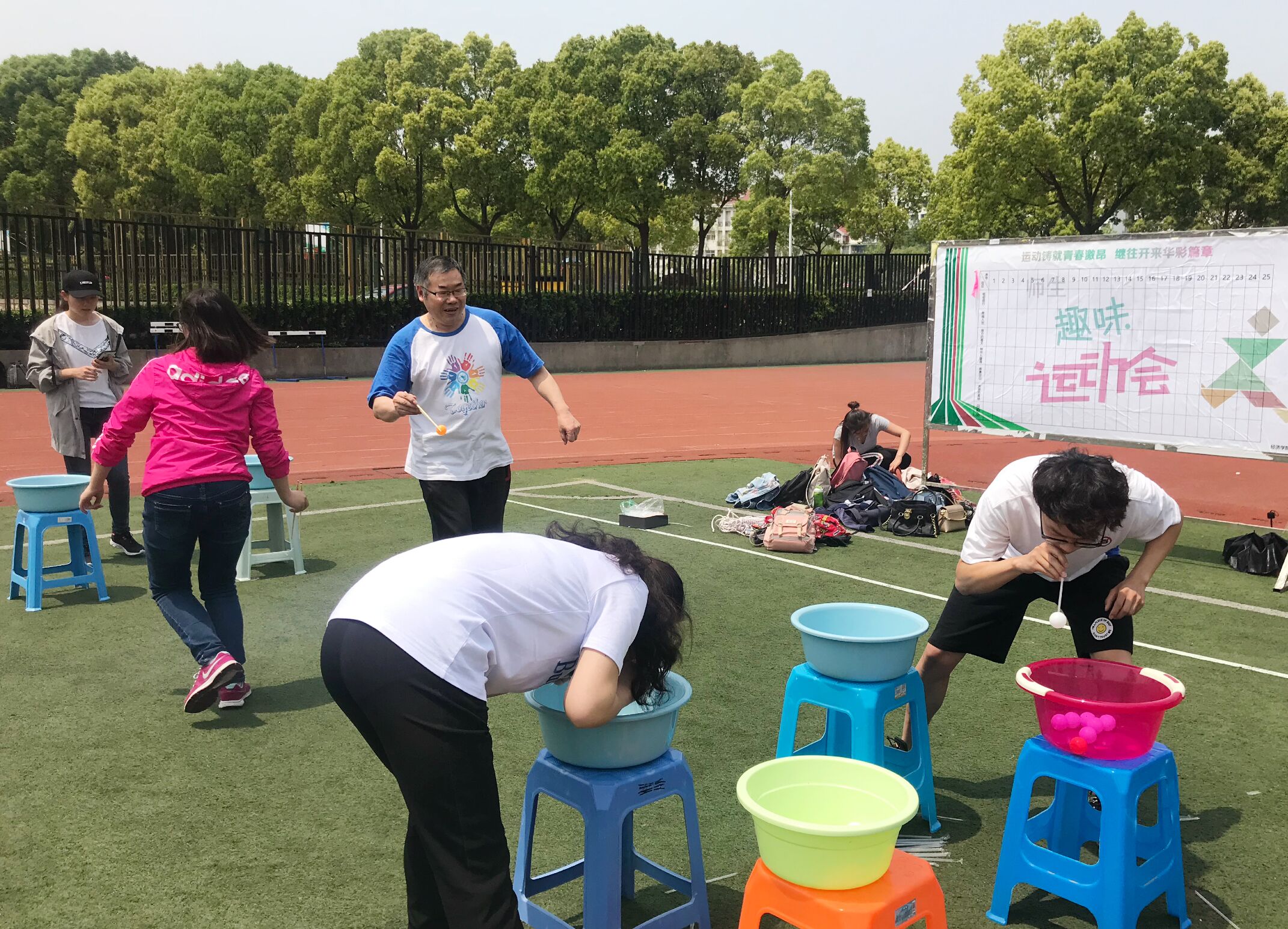 “砥砺前行”比赛中,师生组抓稳节奏,从容不迫,在一分钟内一人用筷子将第一个碗里的乒乓球夹到第二个碗里,另一人用吸管将第二个碗里的乒乓球吸到第三个碗。“跨越入世”比赛中,师生穿上麻袋双腿并拢,奋力向前跳跃,交替完成来回的袋鼠跳。“南方的春天”中,教师和学生穿上体育博彩