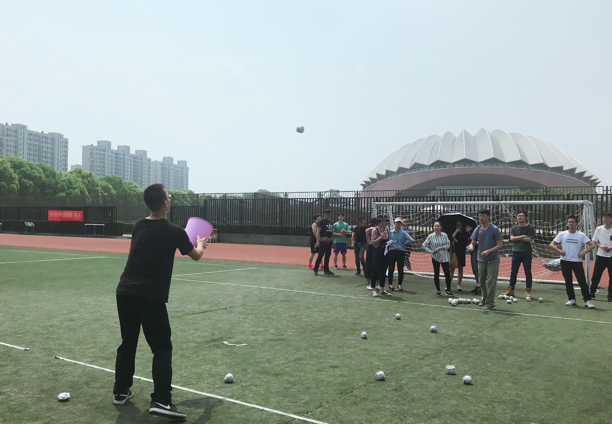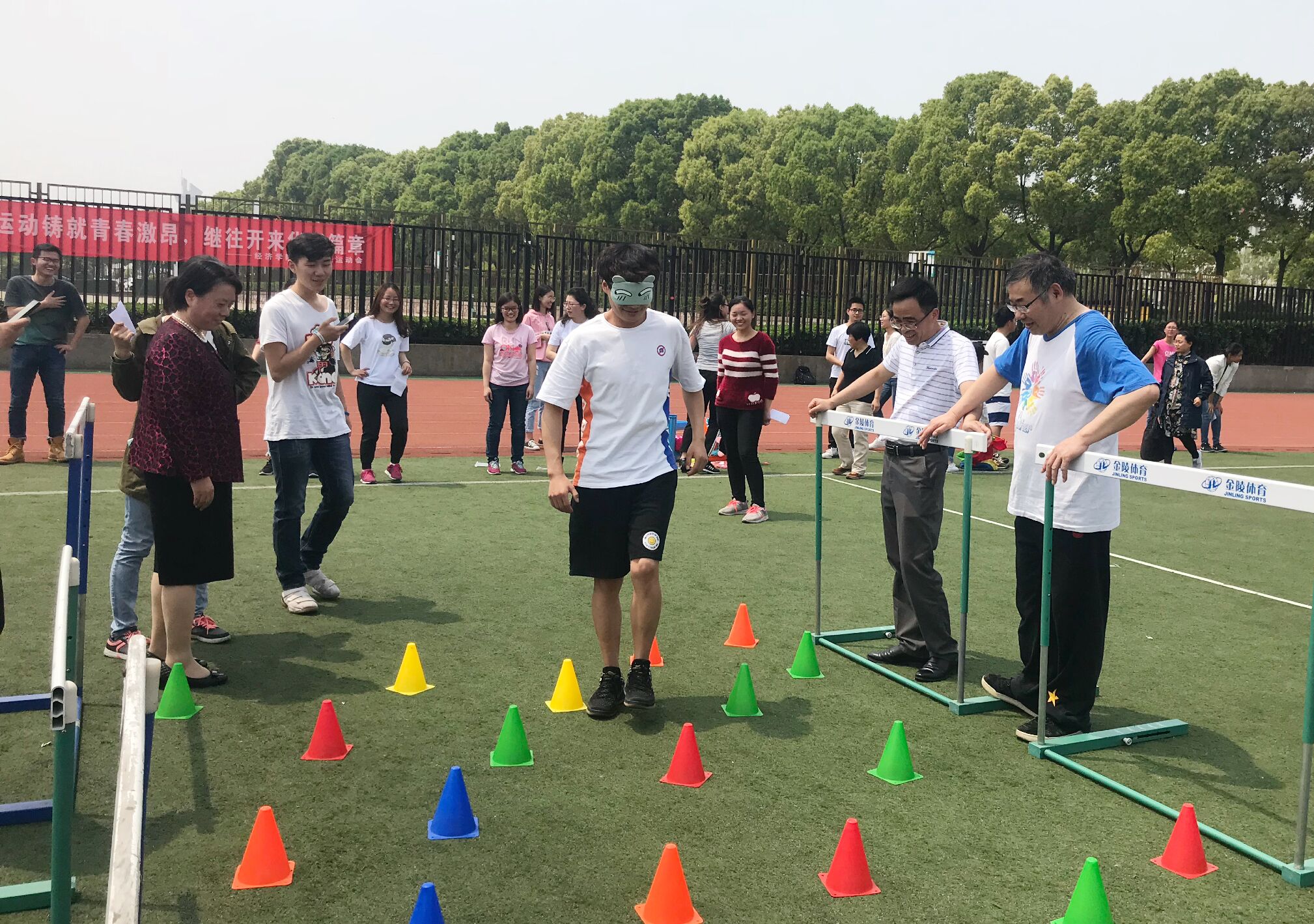 院服接力传送气球,比赛激烈角逐,精彩纷呈。“神舟入星海”是一人抛球一人用篓子接球。有的队伍中,老师瞄准篓子,博力一抛,学生找准球的落地方向,竭力接住,配合默契;有的队伍迅速抛球、接球,接连不断。比赛场上,一名运动员指挥着另一名蒙着眼的运动员敏捷地跨过障碍物,共同参与“港澳回归”趣味比赛,“左移、停。现在保持平衡,大步迈前。”激动的指挥声显示出运动员的认真和细心。移动的指压板上,师生接力奋勇奔跑,拼搏前行,竞技“奔驰的高铁”项目,彰显运动风采。