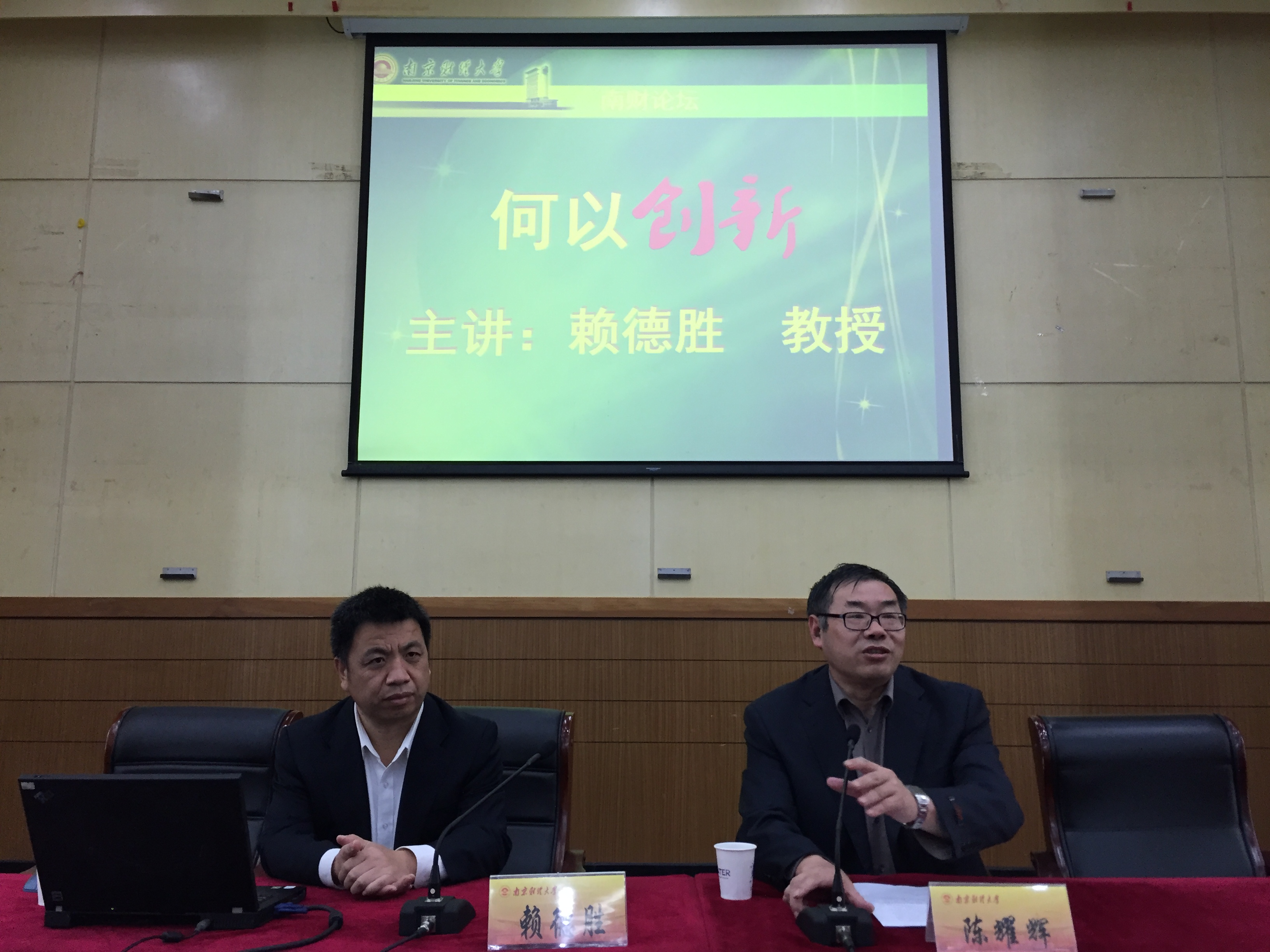邀请,北京师范大学经济管理学院院长赖德胜教授来我校讲学,在仙林校区管理学科楼二楼报告厅作了题为“何以创新”的报告。报告会由副院长(主持工作)陈耀辉主持,学院相关师生聆听了报告。