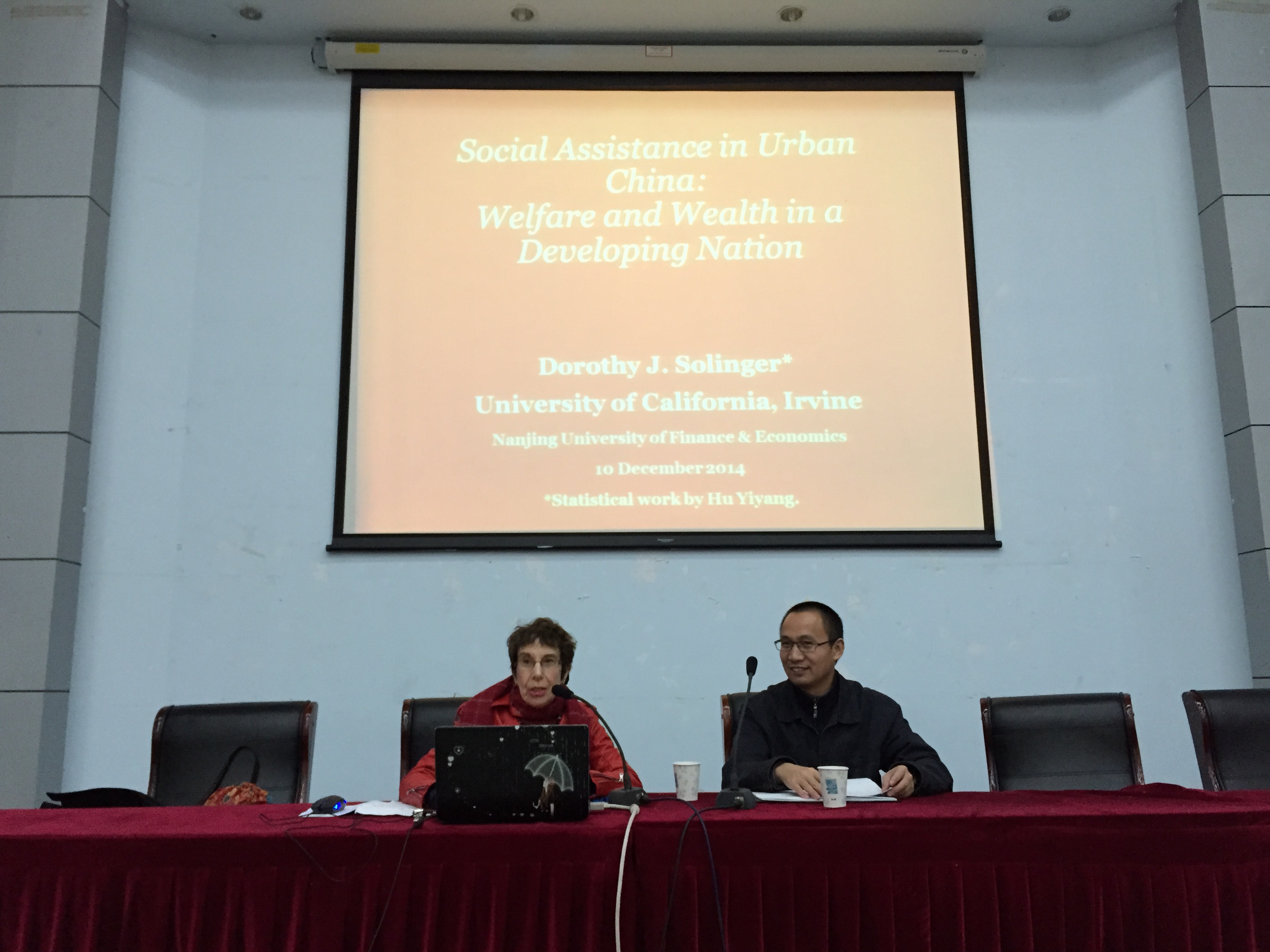 Solinger教授报告的主题是:各地政府如何分配最低生活保障资金。Solinger教授利用中华人民共和国民政部提供的600多个城市微观调查数据和统计年鉴数据,发现了有意思的现象:越是经济发达地区,越有可能将低保资金分配给残疾人和失业人员。Solinger教授认为,这是由于清洁卫生的环境,良好的市容市貌,有利于引进外商直接投资,吸引游客,从而促进经济发展。而对于经济落后地区,由于财政资金的约束,以及吸引外商直接投资和游客的能力弱,更容易导致残疾人和生活困难者在街头谋生,领取低保的居民中残疾人和失业人员的比重低,灵活就业者的比重高。