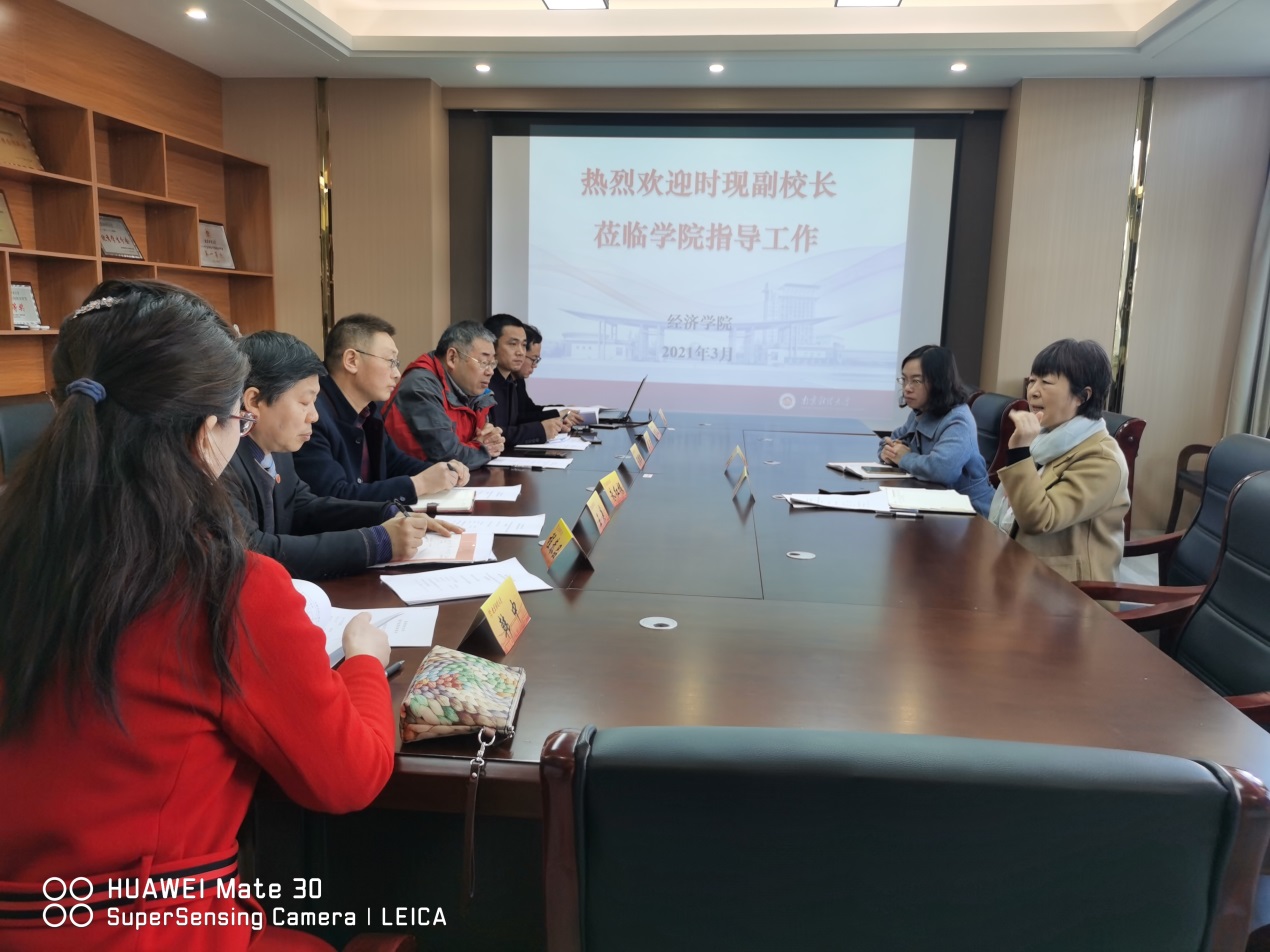 的本科教育工作做出了具体指导。要求学院在师资队伍建设、实验室和实践基地建设和教育教学改革等方面做好顶层设计,提前筹谋规划,主动积极与学校领导及相关部门请示沟通,协调制定出切实有利于学院发展的建设规划。随后,时现副校长重点对学院校级教学成果奖的申报工作进行了指导。她要求学院以经济学和经济统计学两个国家级一流本科专业建设为契机,做好此次教学成果奖的申报工作。建议学院整合现有优势资源,凝练出两个方向,体现出两个专业的特色,进而集中优势力量,将学院近年来在教学方面取得的丰硕成果客观公正地展现出来,争取进一步冲击省级乃至国家级教学成果奖,全面提高学院的专业建设水平。