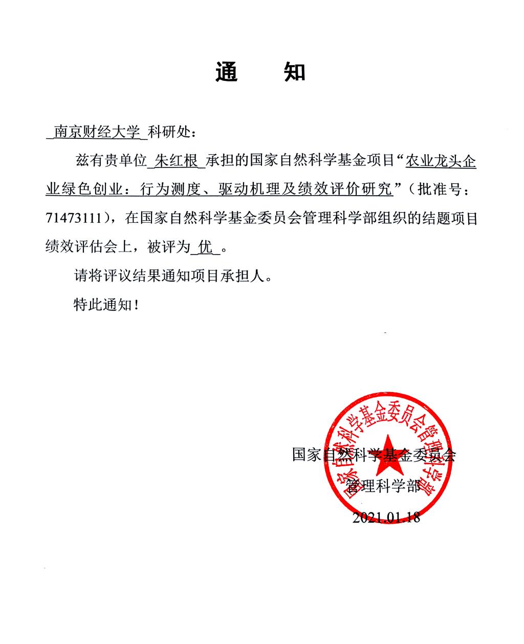 朱红根教授主持的国家自然科学基金面上项目“农业龙头企业绿色创业:行为测度、驱动机理及绩效评价研究”(批准号:71473111),被评为“优”等级,这也是朱红根院长连续第3个国家自然科学基金项目结题绩效获得"优"等级。