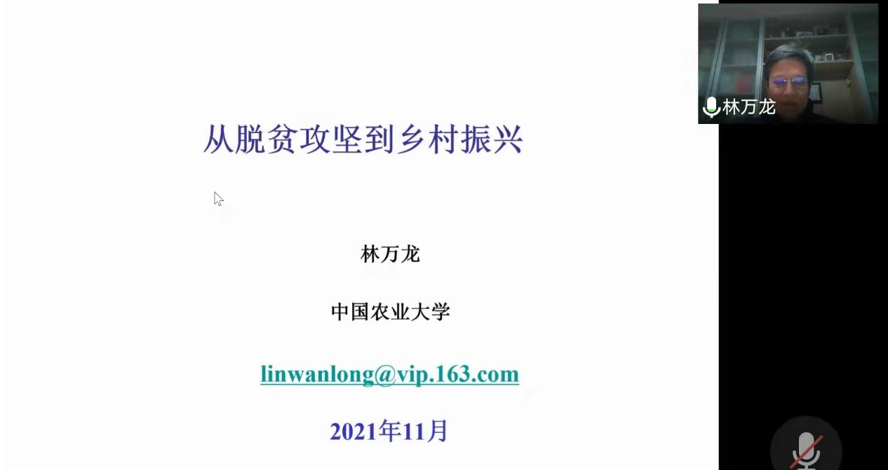 林万龙教授首先讲述了我国脱贫攻坚的伟大成就。他指出,我国脱贫地区经济社会整体面貌发生了历史性巨变,乡村治理明显改善。对世界而言,我国脱贫攻坚对全球减贫事业做出了巨大贡献。林万龙教授接着介绍了乡村振兴战略的背景及意义,他结合近年来乡村振兴的政策文件指出:长远来看,我国将始终有大量人口居住在乡村,城乡差距仍然很大,我国共同富裕的路还很长,农业基本盘必须稳住。