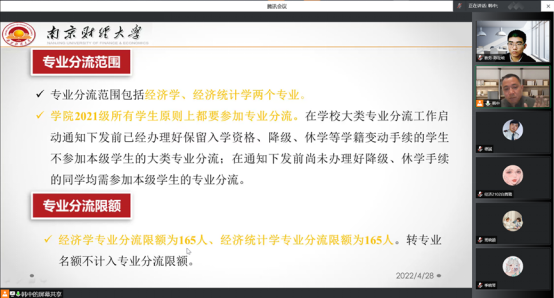 2021级本科生专业分流宣讲会”。会议由学院副院长韩中主持,学院党委副书记袁怡琨,统计系主任程恭品、经济系主任陈杰、统计系王庚教授、经济系章莉教授、辅导员梁少颖、班主任吴昊、教学秘书陈祉岐以及学院部分教师和院内外2021级本科生参加了会议。