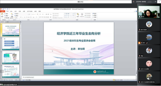 学院党委副书记袁怡琨对近3年学院经济统计学和经济学两个专业学生就业、升学、出国情况作了全面细致的梳理,通过图、表的形式以详实的数据全面介绍了学院专业毕业生的就业率、考研率,并结合经济学、经济统计学专业各自特点对疫情影响下学生就业的选择做了初步规划并给出了具体的指导意见。