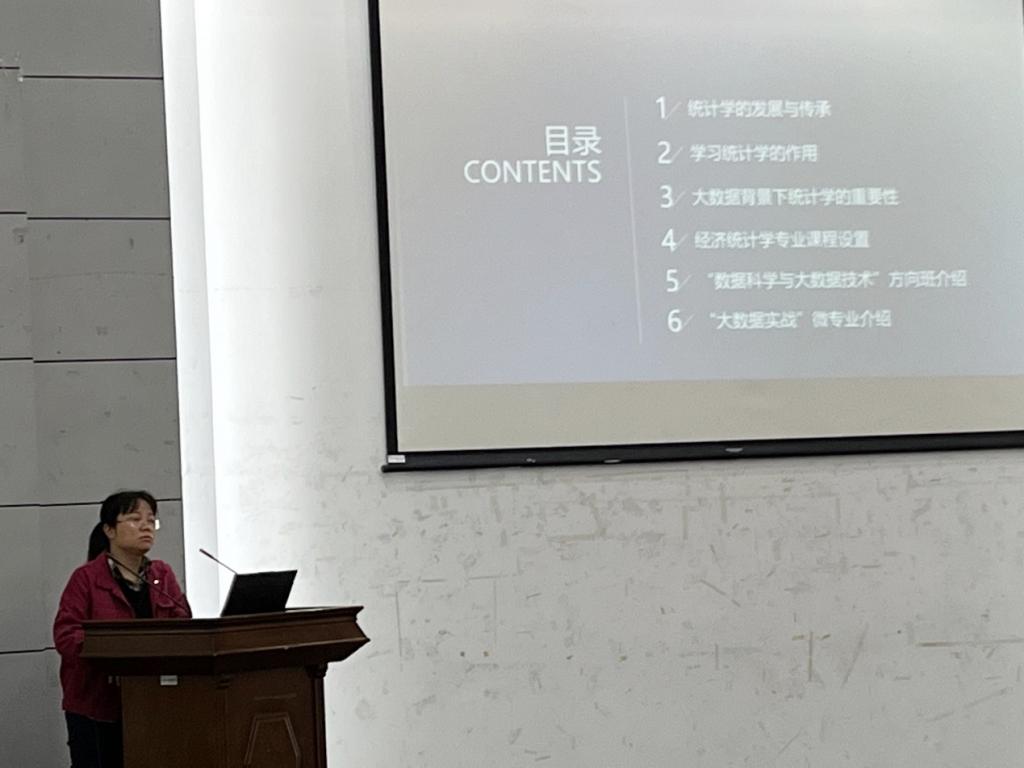 随后由统计系系主任程恭品老师对经济统计学专业做了详细阐述,她从统计学的起源以及发展,联系当前热门学科,对经济统计学专业以及数据科学与大数据技术方向班的优势进行深入剖析,强调了经济统计学在各领域的重要应用。