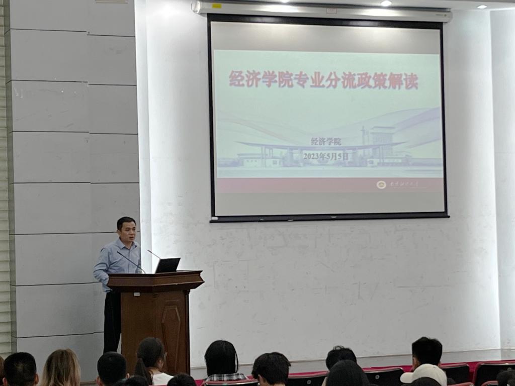 于2023年5月5日于德经楼二楼报告厅举办“2022级本科生专业分流宣讲会”。会议由副院长韩中主持,程恭品主任、刘余主任、华中昱主任和学院2022级全体本科生参加了会议。