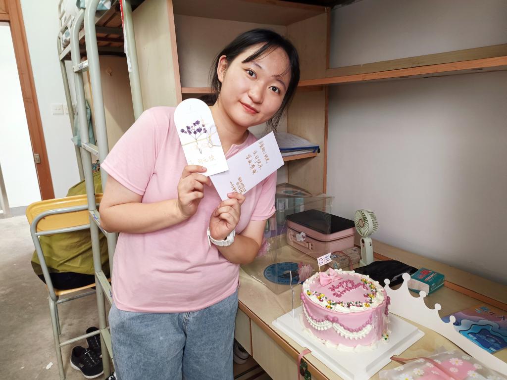 学院老师们专门为2位新生准备了生日蛋糕、贺卡及礼物,来到新生宿舍为小寿星们带来惊喜。在这场充满欢乐和感动的生日会上,张圣兵书记为来自河南的陈乐阳同学送上诚挚的生日祝福,希望陈乐阳同学在本科阶段里好好学习,争取在四年之后取得理想成绩。贾亦璞副书记为同学们分切生日蛋糕,与同学们一起为来自贵州的刘元续同学送上美好祝愿。