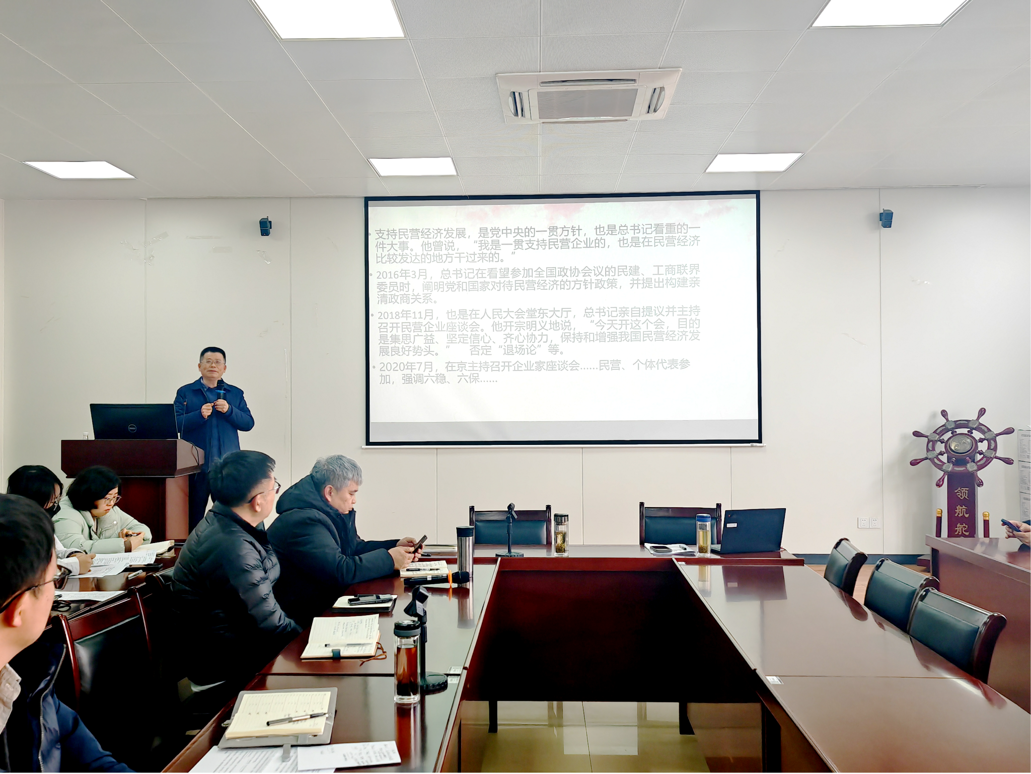 此次学习会由学院党委书记张圣兵同志领学,张圣兵书记详细解读了习近平总书记在民营企业家座谈会上的重要讲话内容:习近平总书记强调,民营经济是推进中国式现代化的生力军,广大民营企业和民营企业家要坚定不移走高质量发展之路,加强自主创新,转变发展方式,不断提高企业质量、效益和核心竞争力。这为民营经济发展指明了方向,也为经济学科研究提供了重要指引。