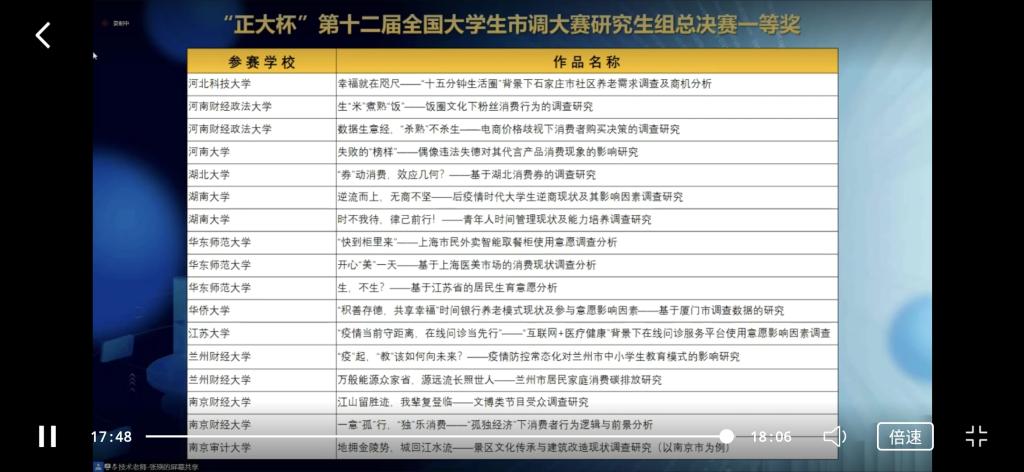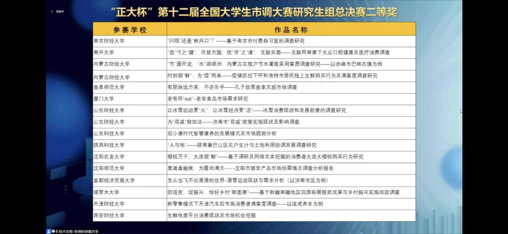 现场宣布第十二届全国大学生市调大赛研究生组总决赛二等奖获奖名单