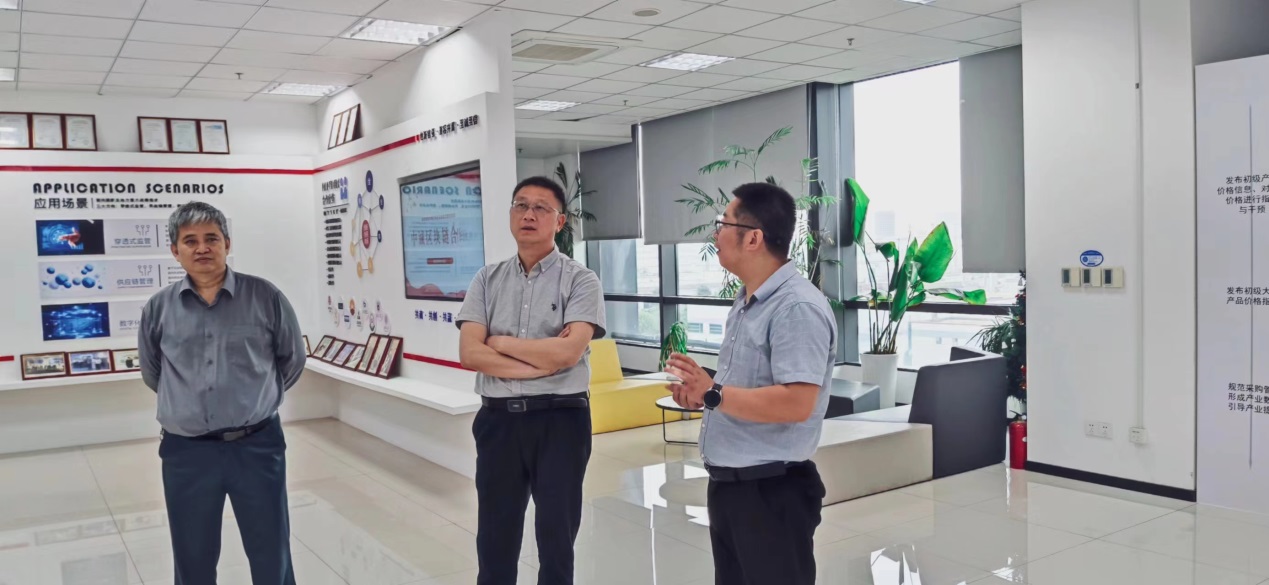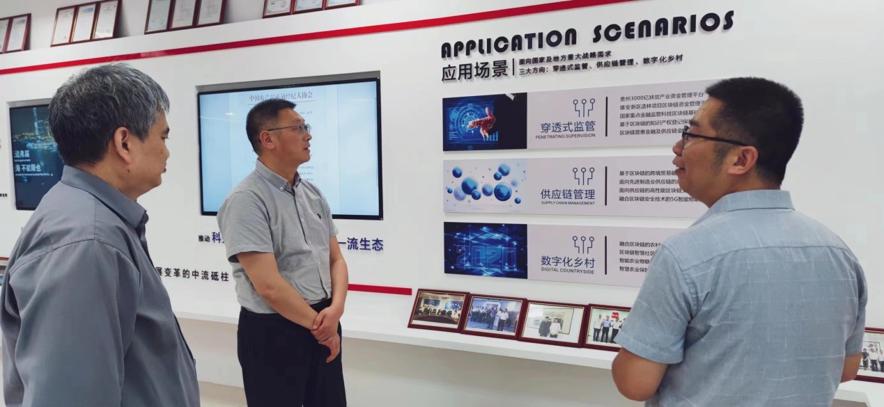 中诚区块链研究院汪洋总经理对体育博彩 领导的到来表示热烈欢迎,并带领朱红根院长一行参观了中诚区块链研究院(南京)有限公司展厅,详细介绍了中诚区块链研究院的发展背景、基本情况及在金融监管、数字农业方面的应用场景。