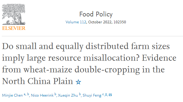 该论文全文链接如下:Chen, Minjie, Nico Heerink, Xueqin Zhu, and Shuyi Feng. "Do small and equally distributed farm sizes imply large resource misallocation? Evidence from wheat-maize double-cropping in the North China Plain."Food Policy112, (2022): 102350。FoodPolicy是SSCI农业经济与政策领域的顶级期刊,同时位于经济学、发展经济学等领域Q1区,2021年影响因子为6.08。该期刊主要关注发展中国家、转型期国家及发达国家食物相关政策的制定、执行与评估研究。