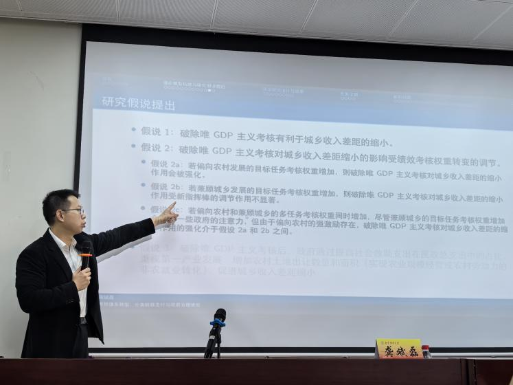 龚斌磊教授首先以地方政府的GDP造假为引入,指出政府绩效评价与考核体系过分重视短期经济增长,呈现出“唯GDP主义”。接着,龚斌磊教授深入浅出地分析了政府绩效考核体系转型与城乡协调发展的因果关系,指出破除“唯GDP主义”的政府绩效考核转型能够显著促进城乡收入差距缩小,并且这一促进作用在以农业优先的新“指挥棒”下得以强化。之后,龚斌磊教授围绕分类转移支付,从基层政府的能力端进一步探讨上述问题,指出当前的财政涉农整合实际上只能推动“面子”工程,而不能有效解决“里子”问题,需要上级部门的专项监督。在讲座中,龚斌磊教授多次强调农经方向的教师和研究生应更加重视“三农”议题,在指出现实问题的同时应努力提供切实有效的解决方案。最后,龚斌磊教授提出了当前新质生产力和经济高质量发展中的两大新问题,鼓励在场师生开展相关研讨。